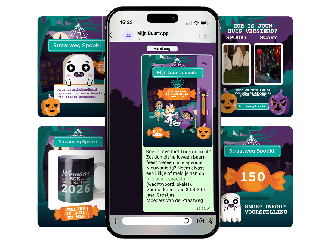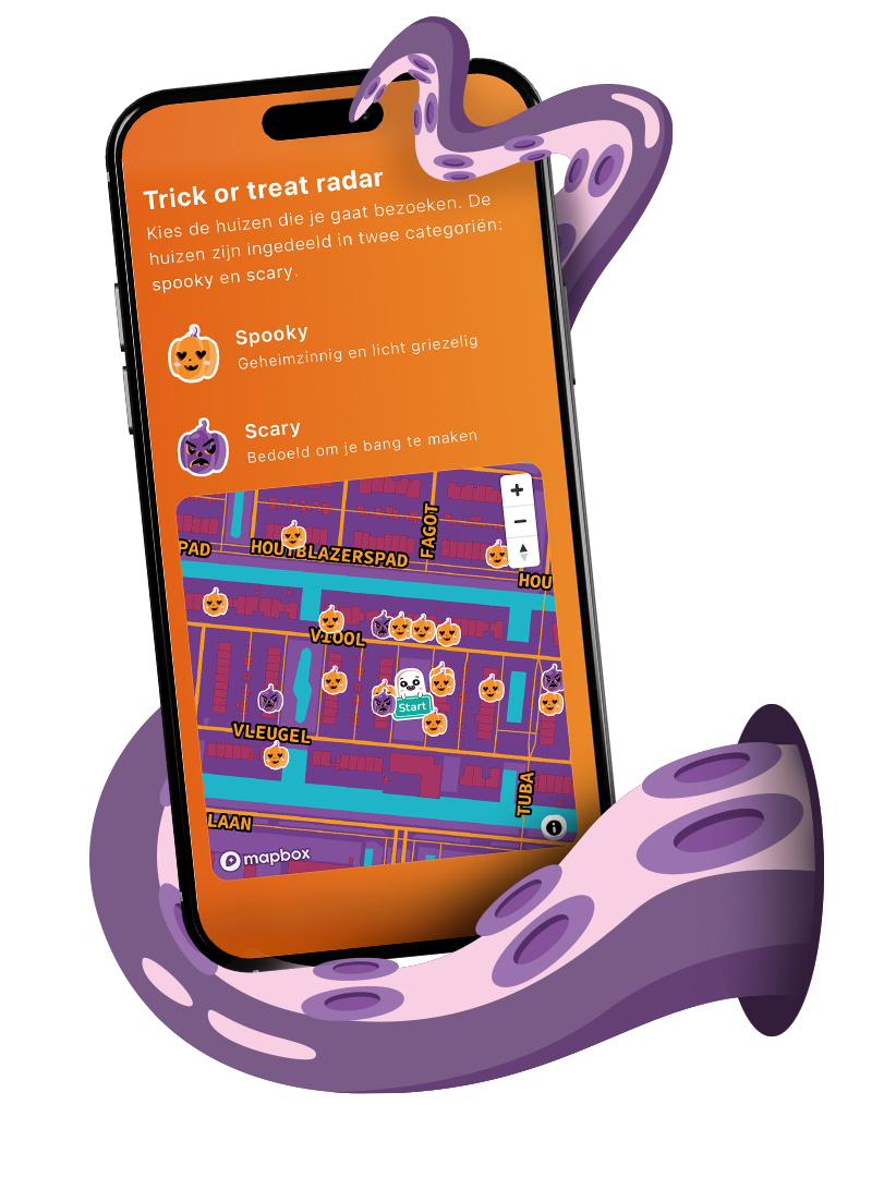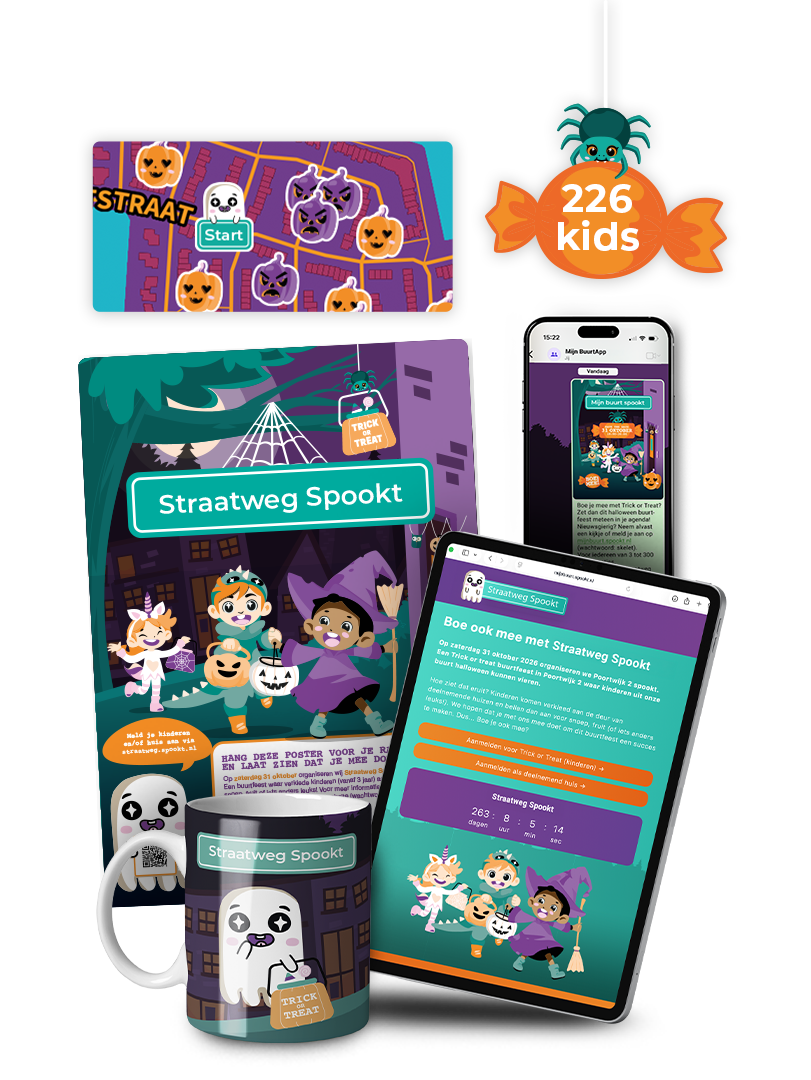 Organiseer in minuten een Halloween buurtfeest met een eigen homepage, trick or treat radar, poster, social toolkit, live statistieken en meer!