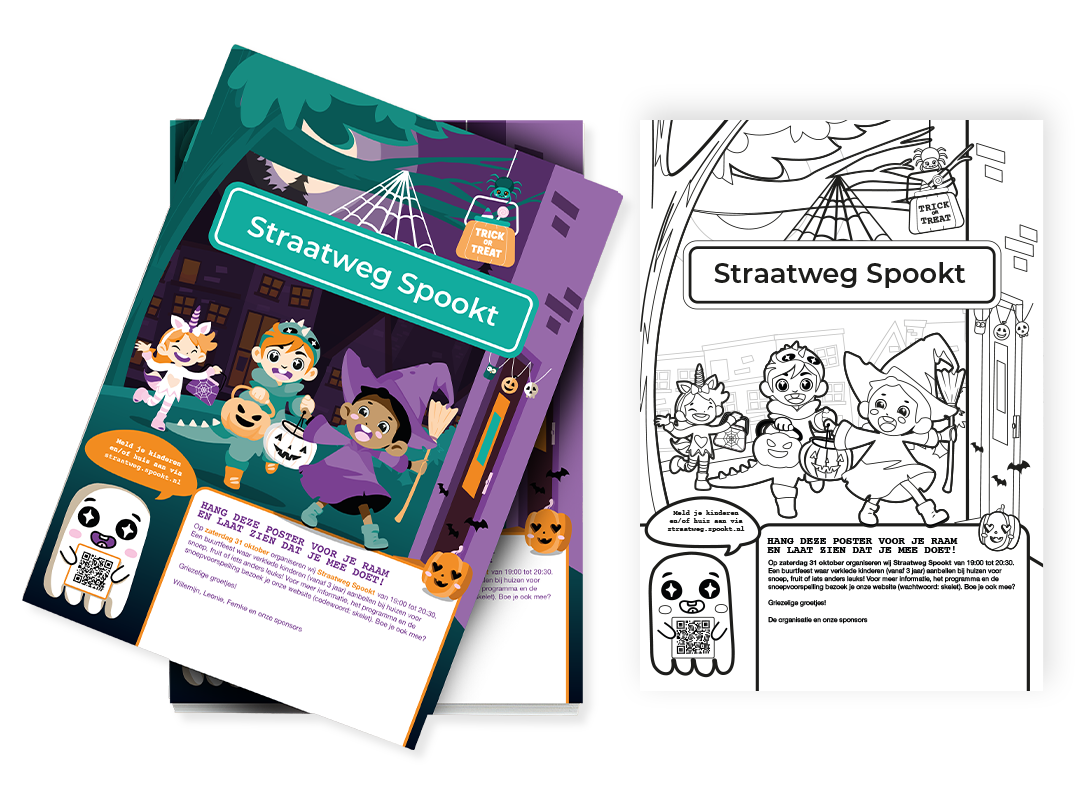 Print zelf uit of druk bij de lokale copyshop (ook een inktbesparende kleurplaat variant). Buurtkinderen bezorgen de posters.